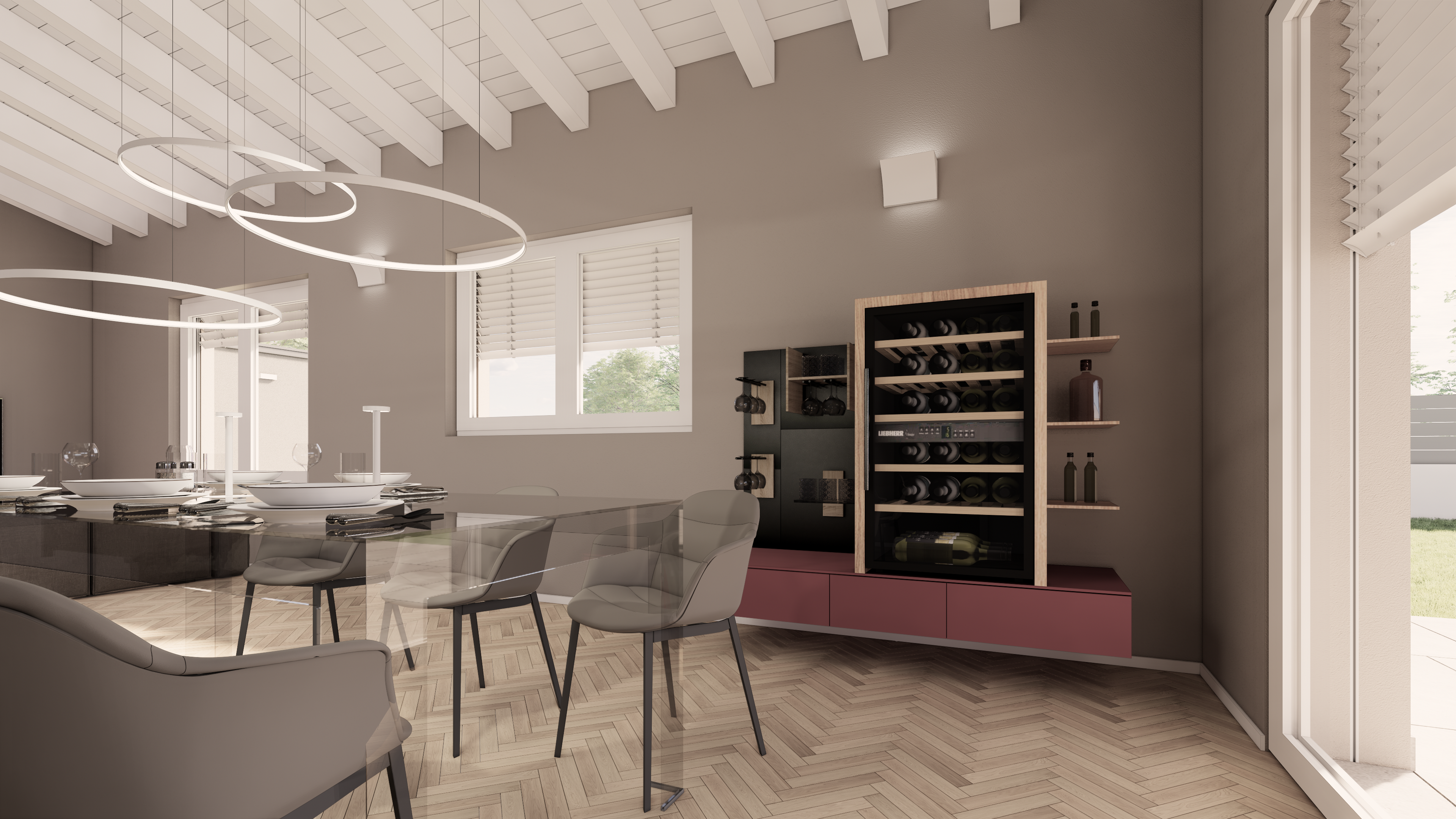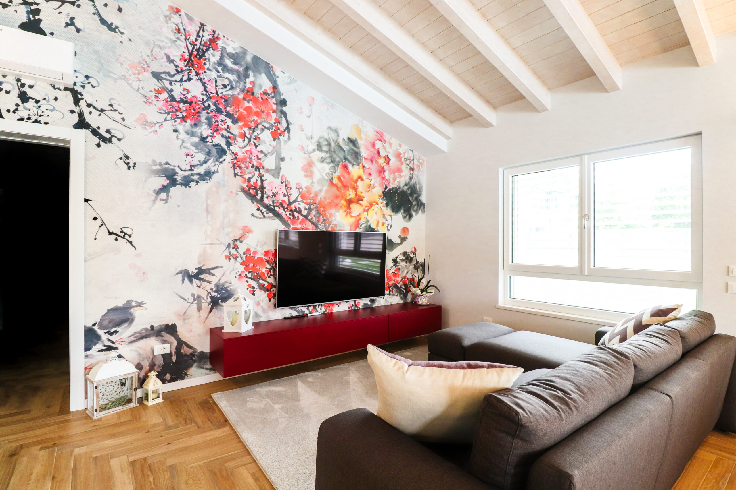 Sul fondo della zona living, una carta da parati floreale definisce l’area Tv, con il divano e il mobile posizionati strategicamente per creare un angolo accogliente che divide il living in due parti. Il design del mobile, in armonia cromatica con la cantinetta vini, contribuisce a un effetto di continuità visiva che dona equilibrio all’ambiente, rendendolo al contempo sofisticato.