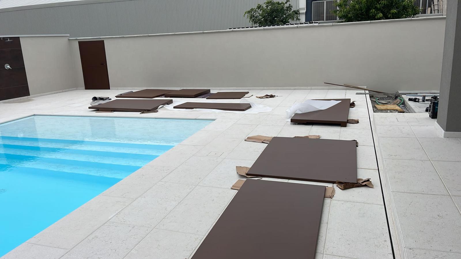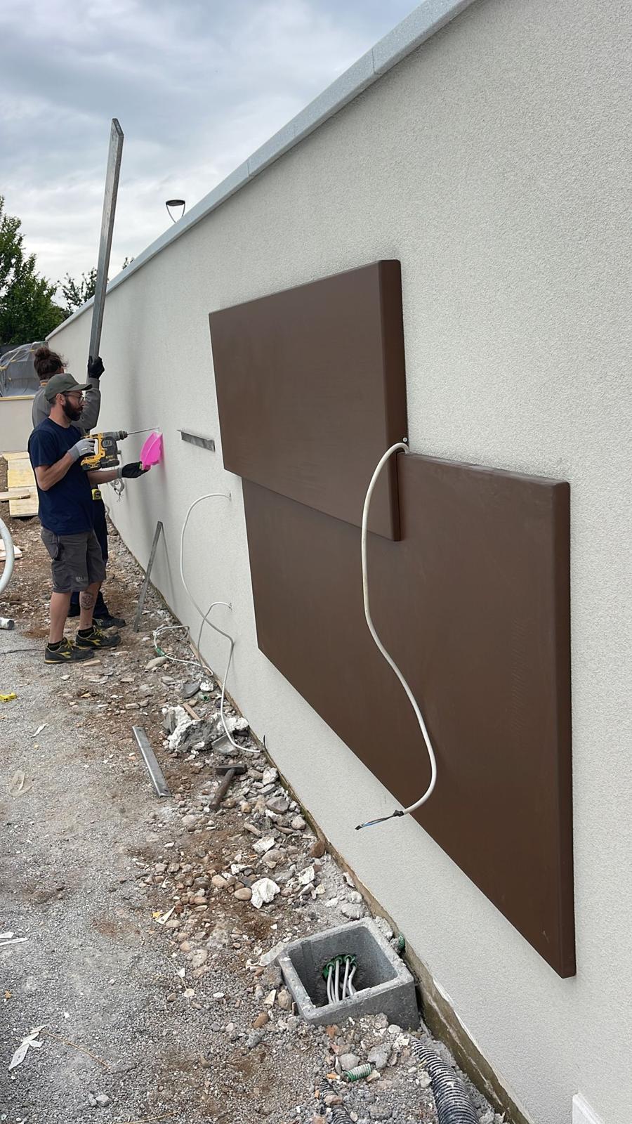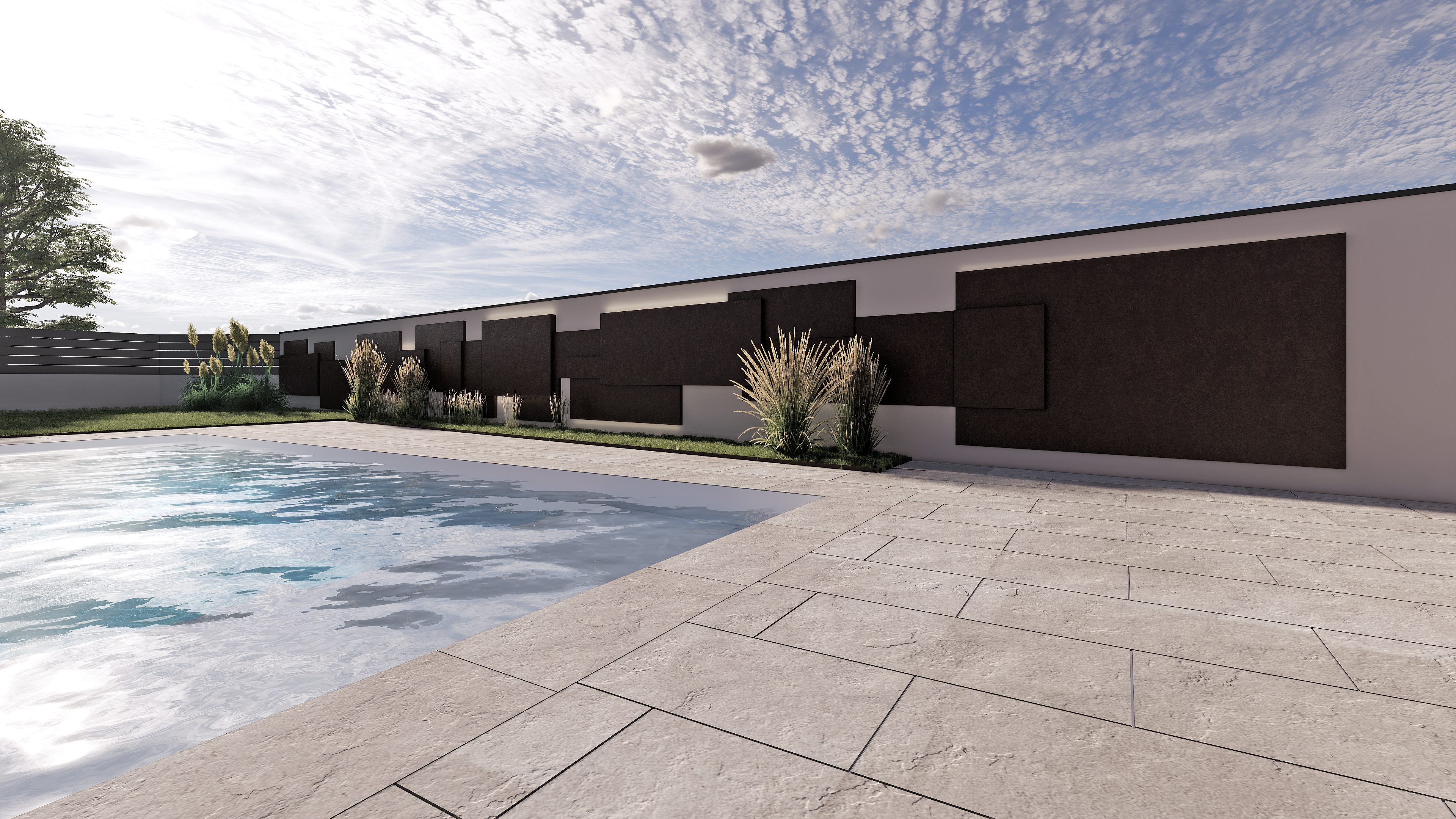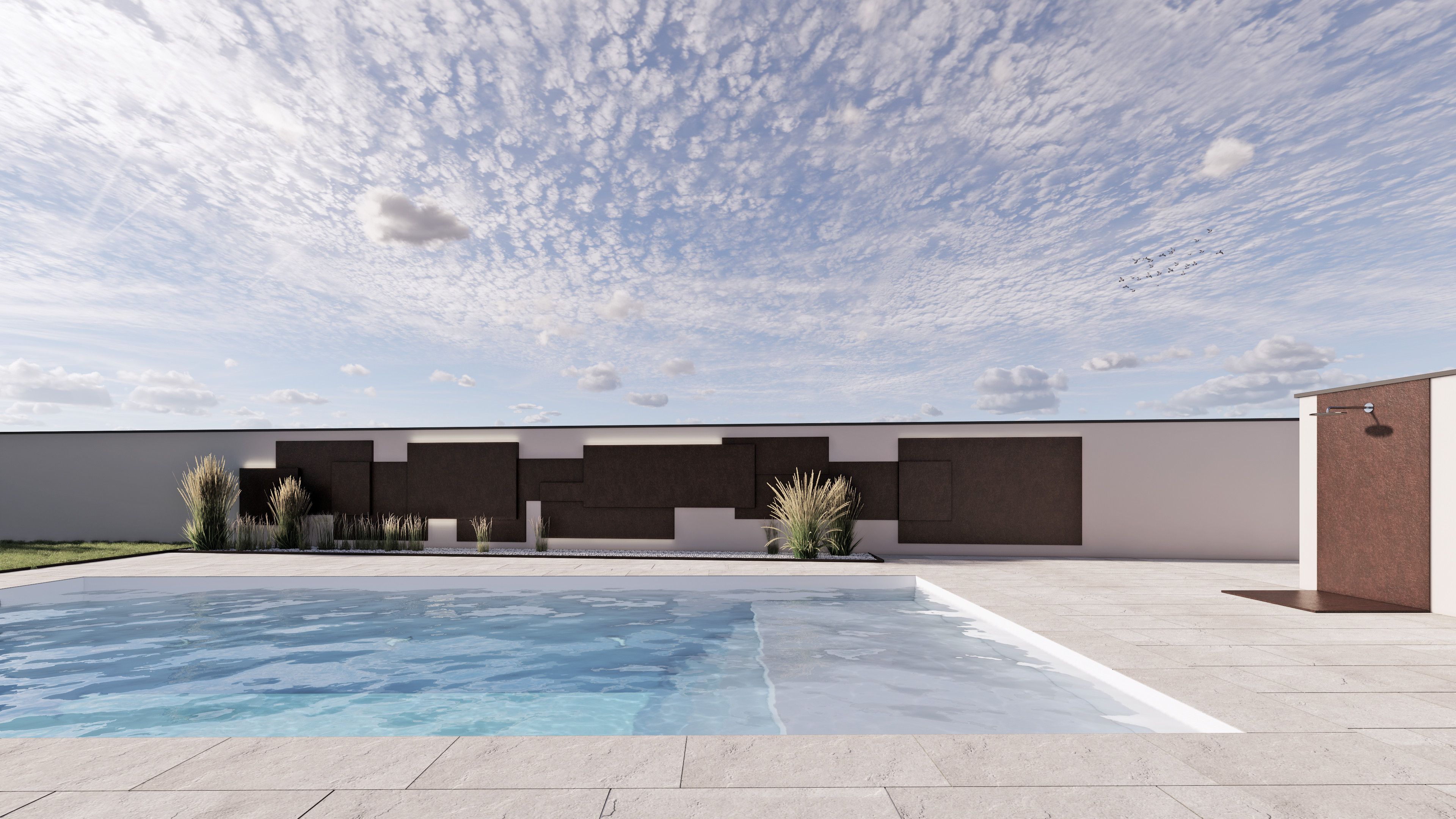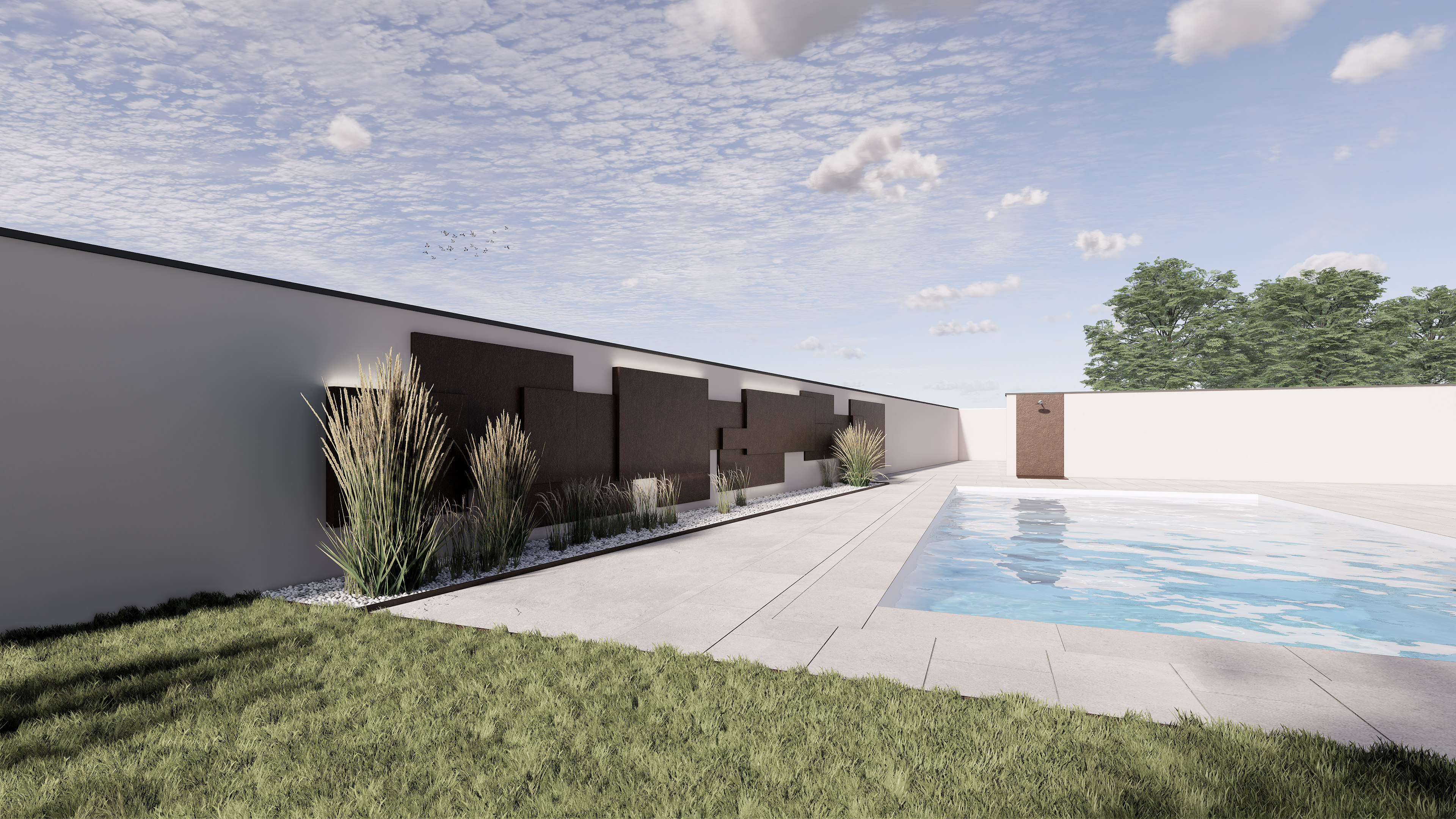 Per il muro fronte piscina, abbiamo progettato un’illuminazione Custom, pensata per valorizzare l’ambiente in ogni momento della giornata. Abbiamo realizzato una struttura di pannelli in ferro verniciati Corten lungo tutta la metratura, che di giorno aggiunge un elemento decorativo, mentre di sera crea un’atmosfera di relax con una luce soffusa e accogliente.