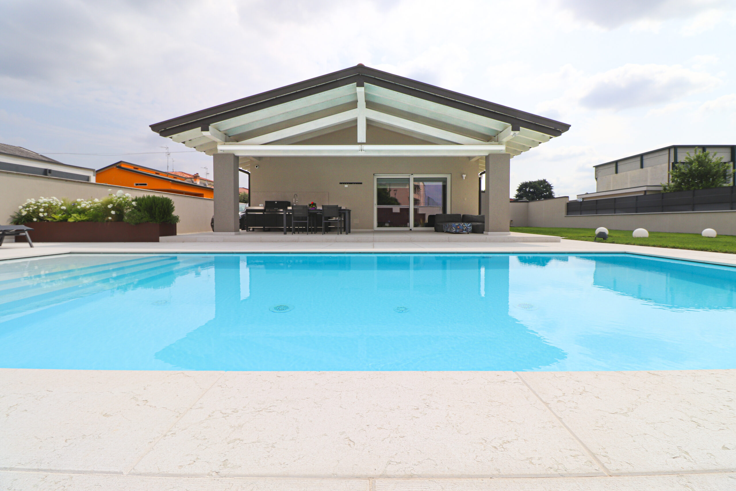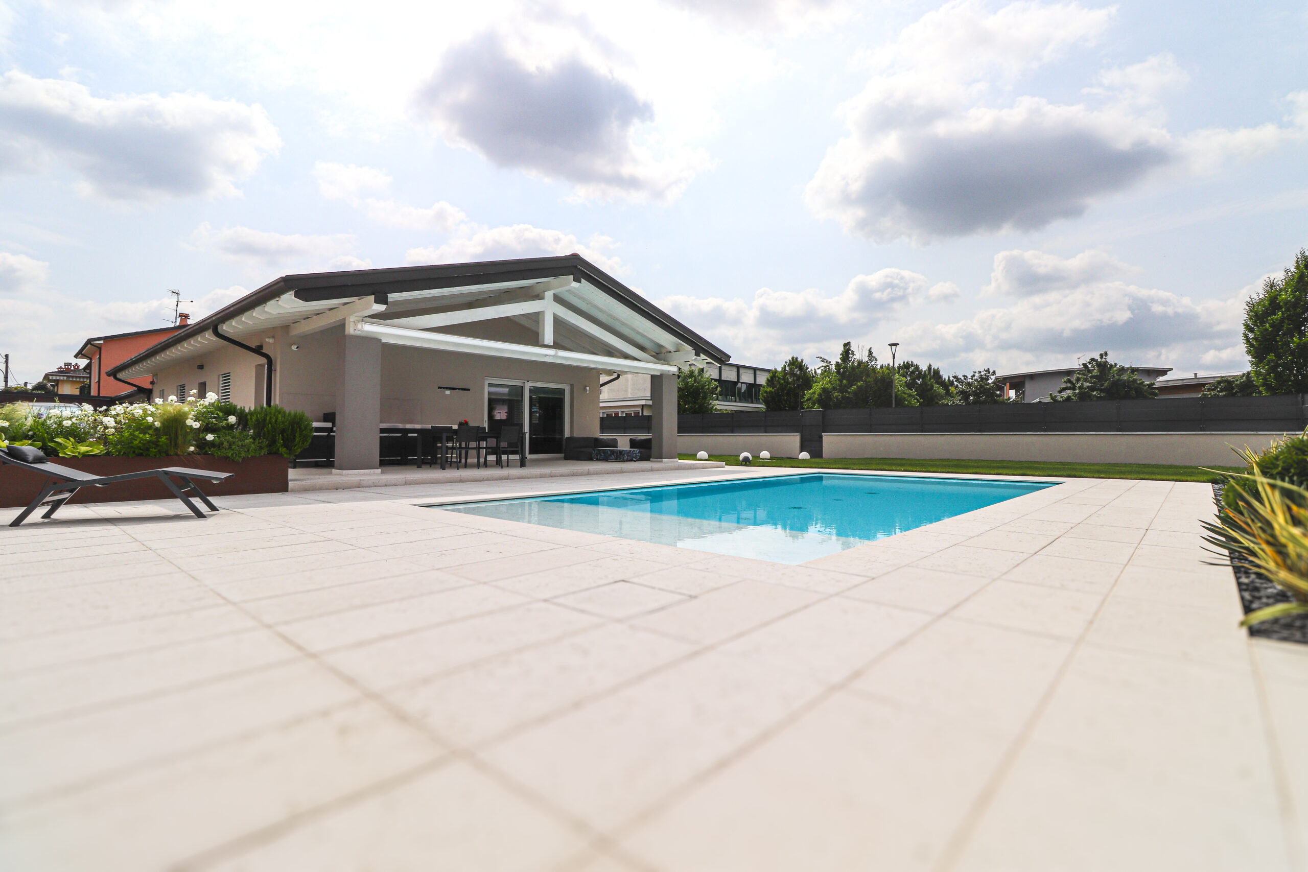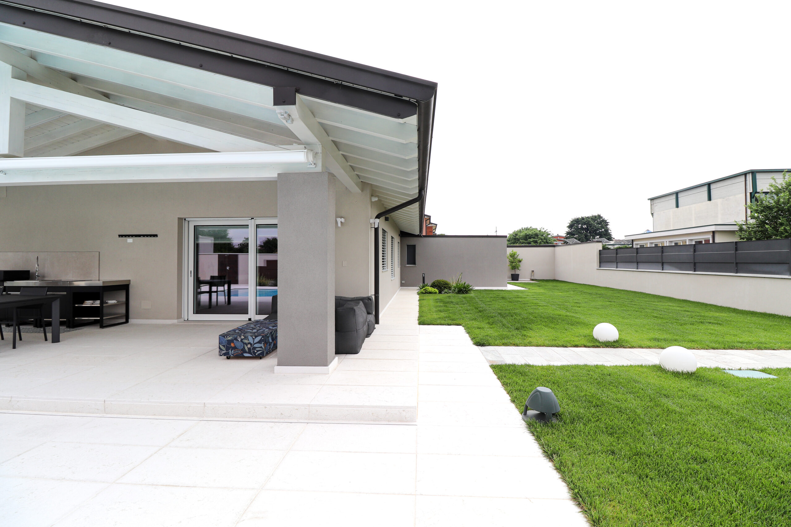 La pavimentazione dell’area frontale del portico è stata accuratamente scelta per circondare la piscina, che diventa il punto focale della zona esterna, arricchita da un’area erbosa laterale che dona un tocco di verde naturale e freschezza, in perfetta armonia con l’architettura della casa.