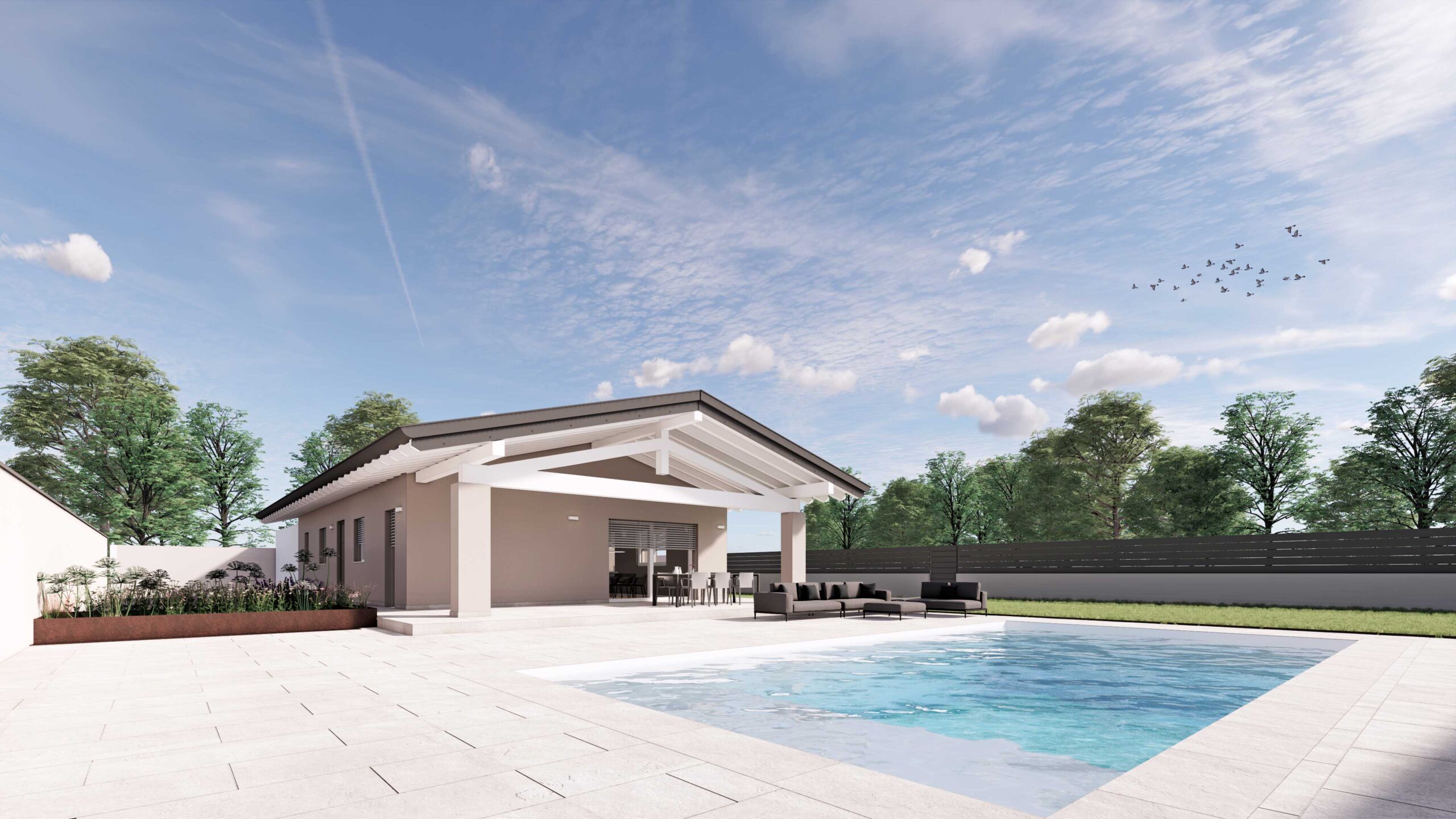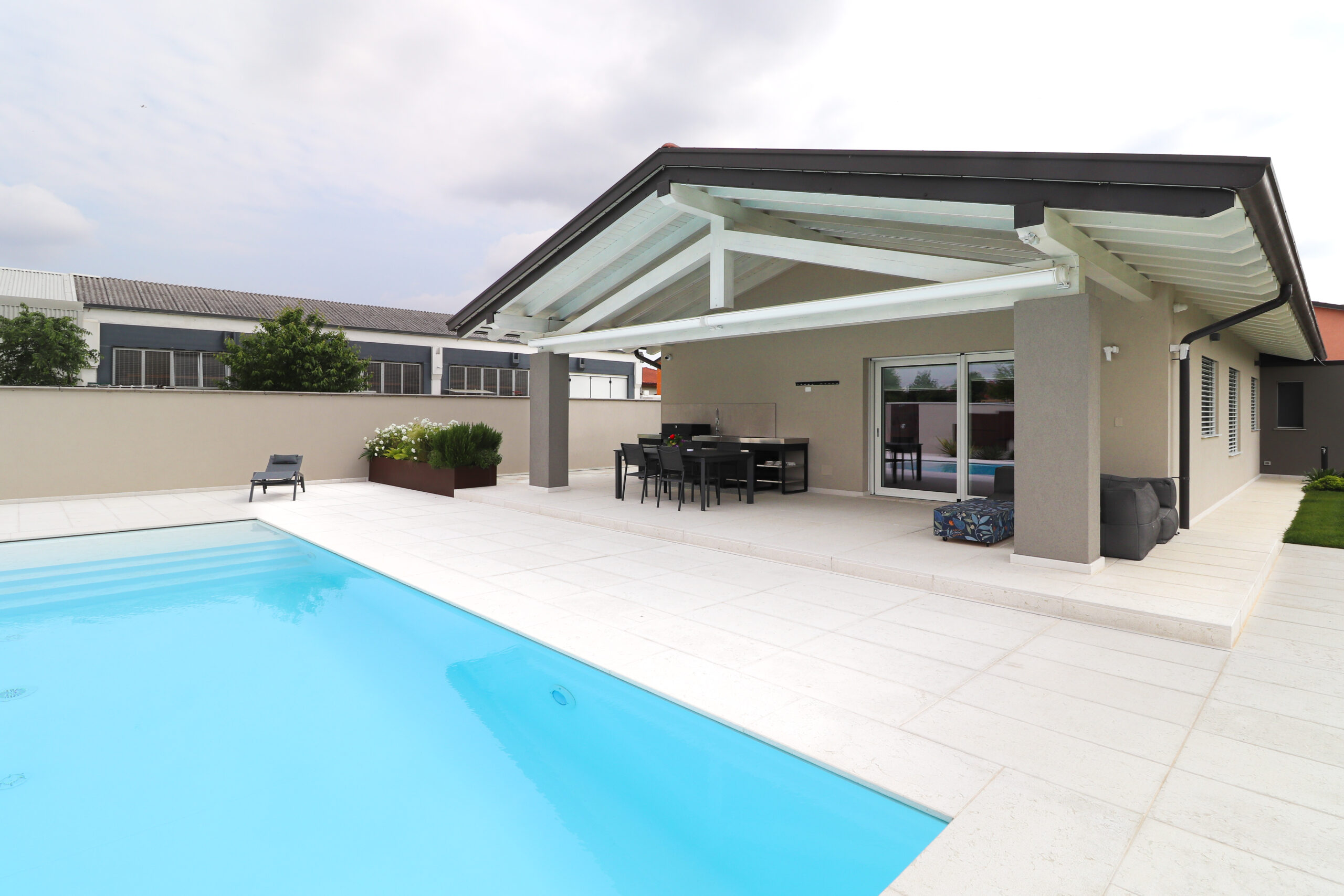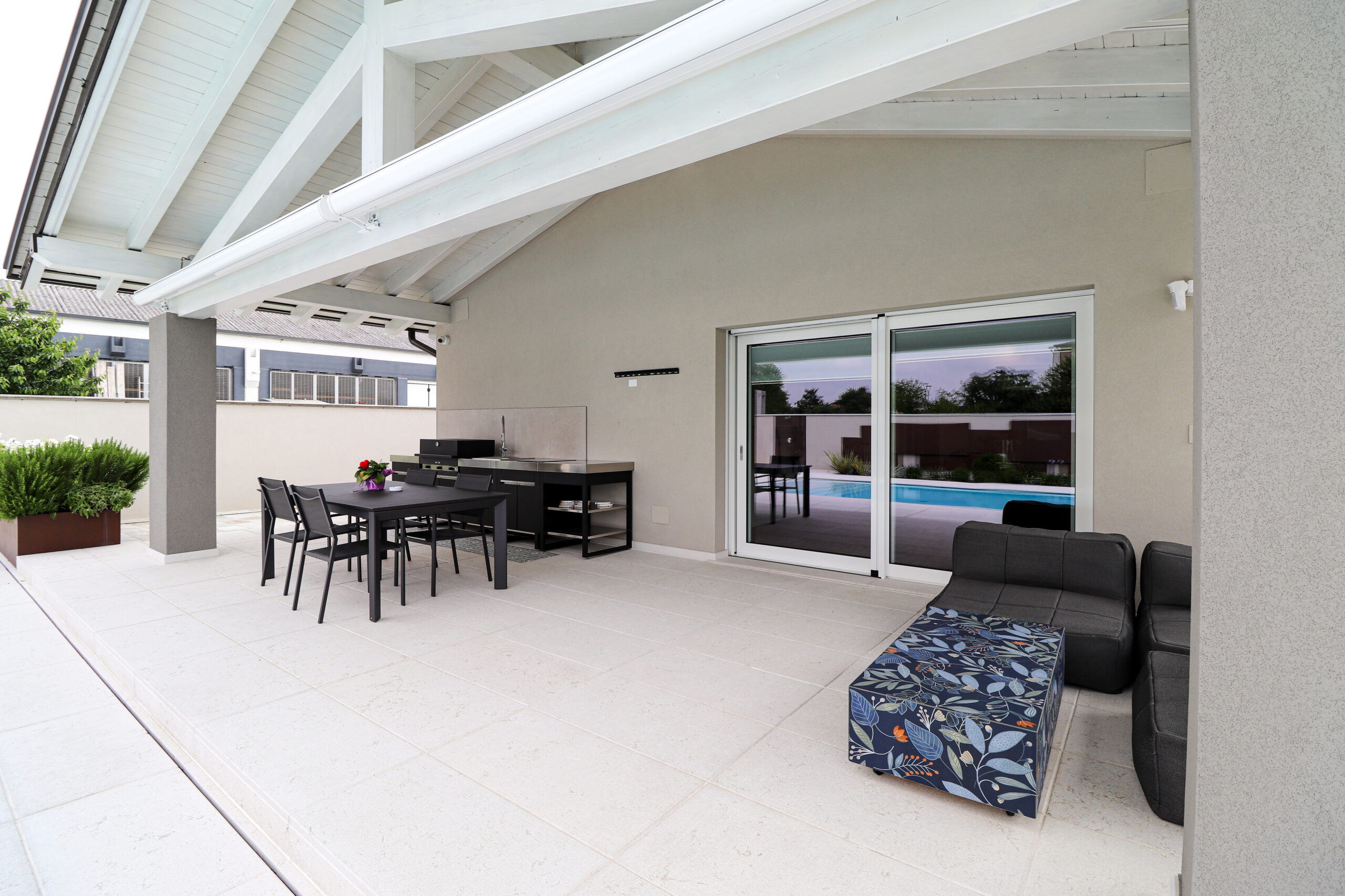 La pavimentazione dell’area frontale del portico è stata accuratamente scelta per circondare la piscina, che diventa il punto focale della zona esterna, arricchita da un’area erbosa laterale che dona un tocco di verde naturale e freschezza, in perfetta armonia con l’architettura della casa.