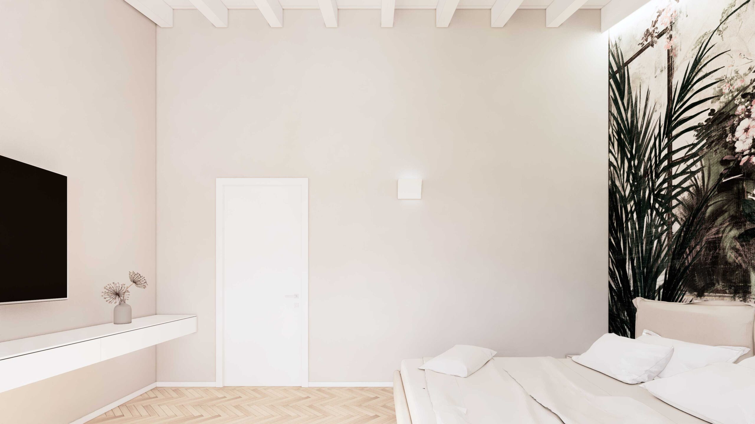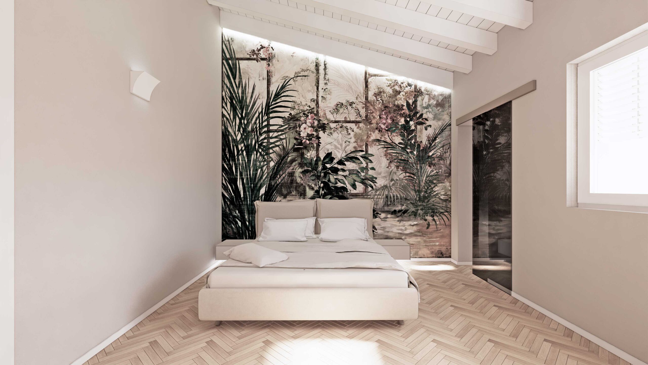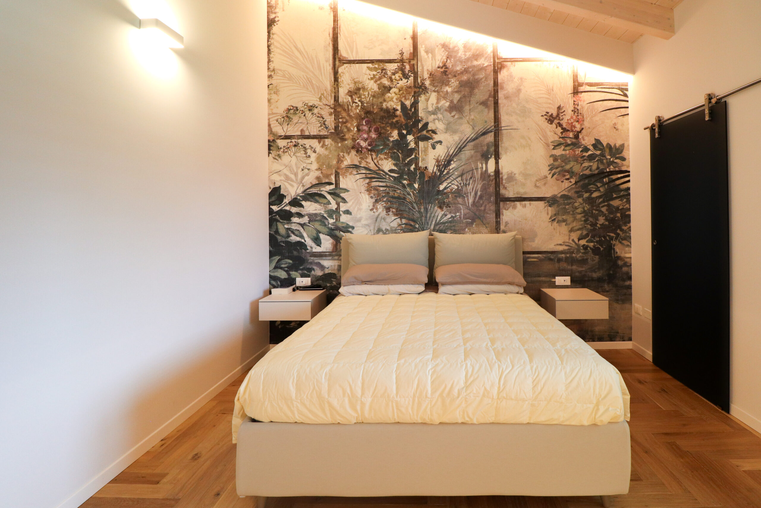 La camera matrimoniale accoglie con un’atmosfera calda e armoniosa. Sul retro del letto, una carta da parati floreale vintage crea un punto focale sul gruppo letto, illuminata nella parte superiore da una linea di LED a scomparsa che illumina in modo indiretto la parete. Il letto imbottito è stato scelto in tonalità neutre, in linea con l’equilibrio cromatico della stanza, e completato da due comodini sospesi dal design semplice e minimale.