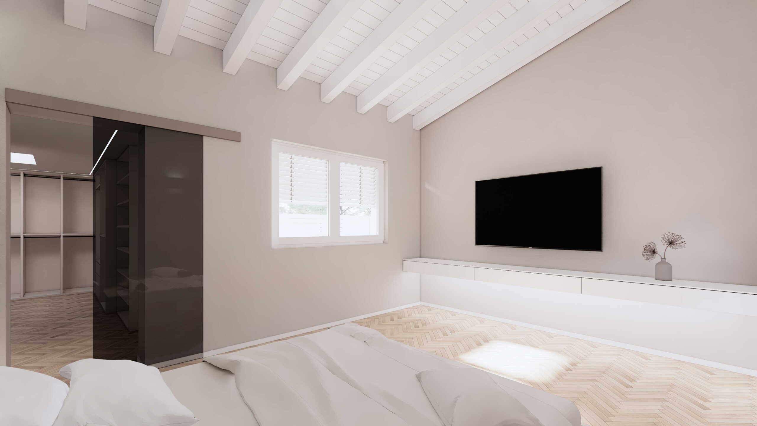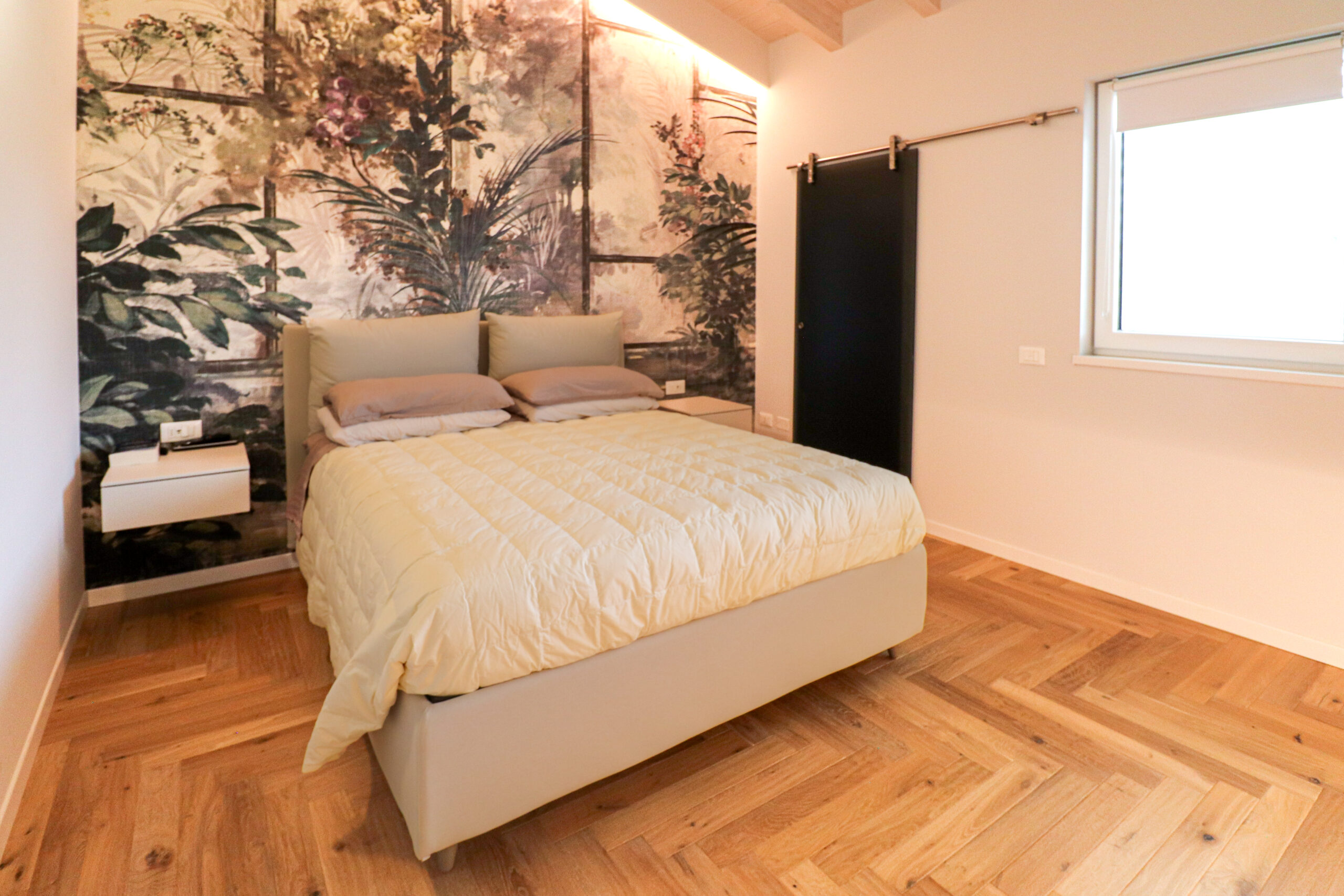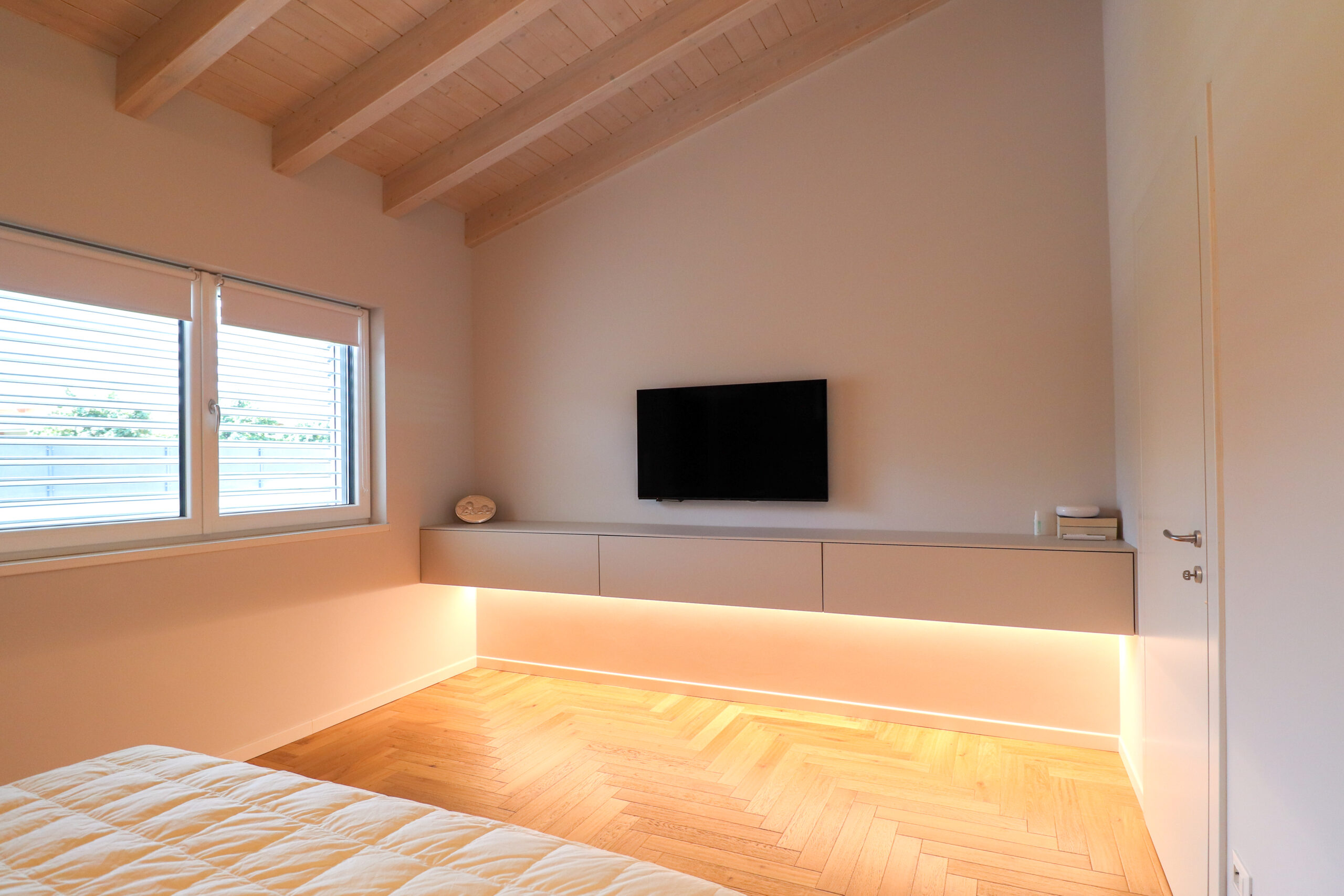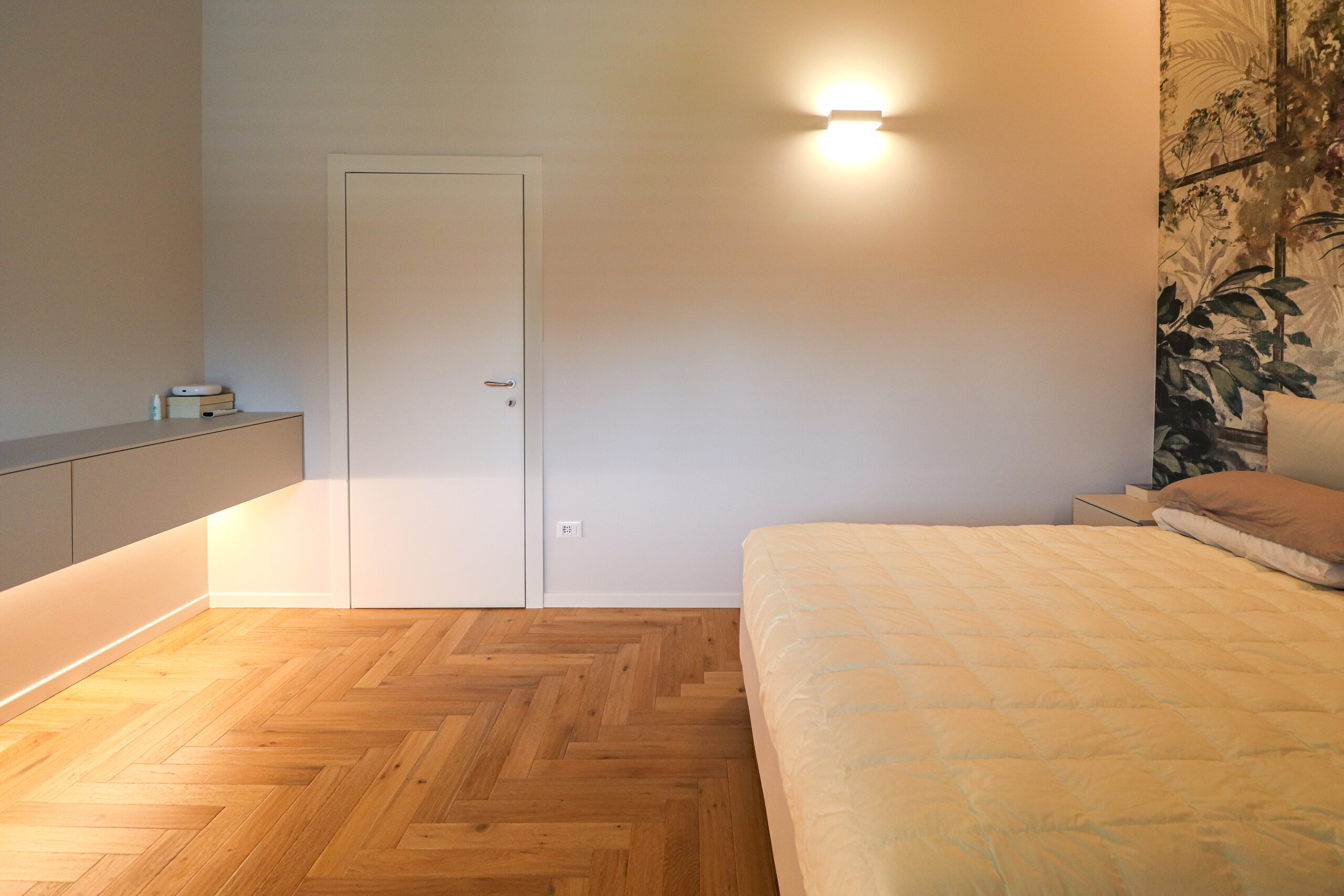 Di fronte al letto, un comò sospeso a tutta parete riprende le tonalità della testata, con un’illuminazione nascosta, aggiungendo profondità e raffinatezza. Ai lati del letto, una porta su binario in una tonalità più decisa introduce alla cabina armadio, completando con stile ed eleganza la stanza.