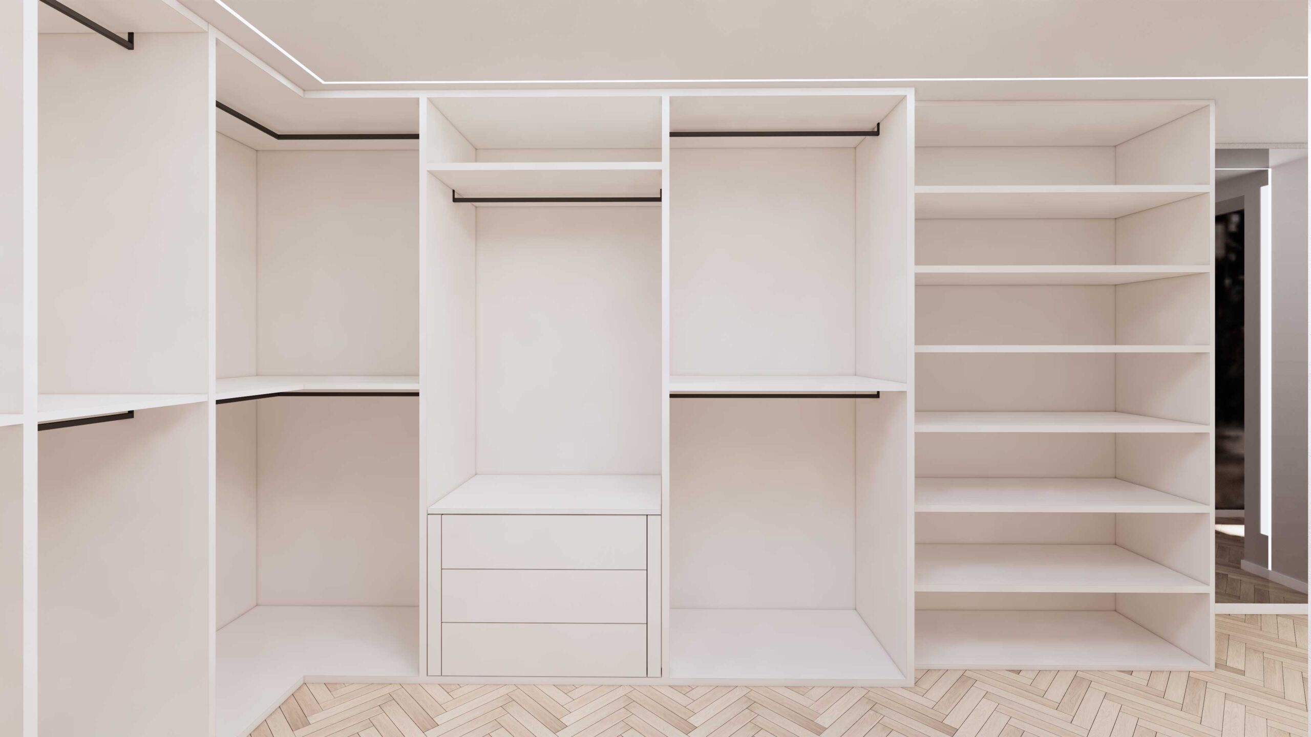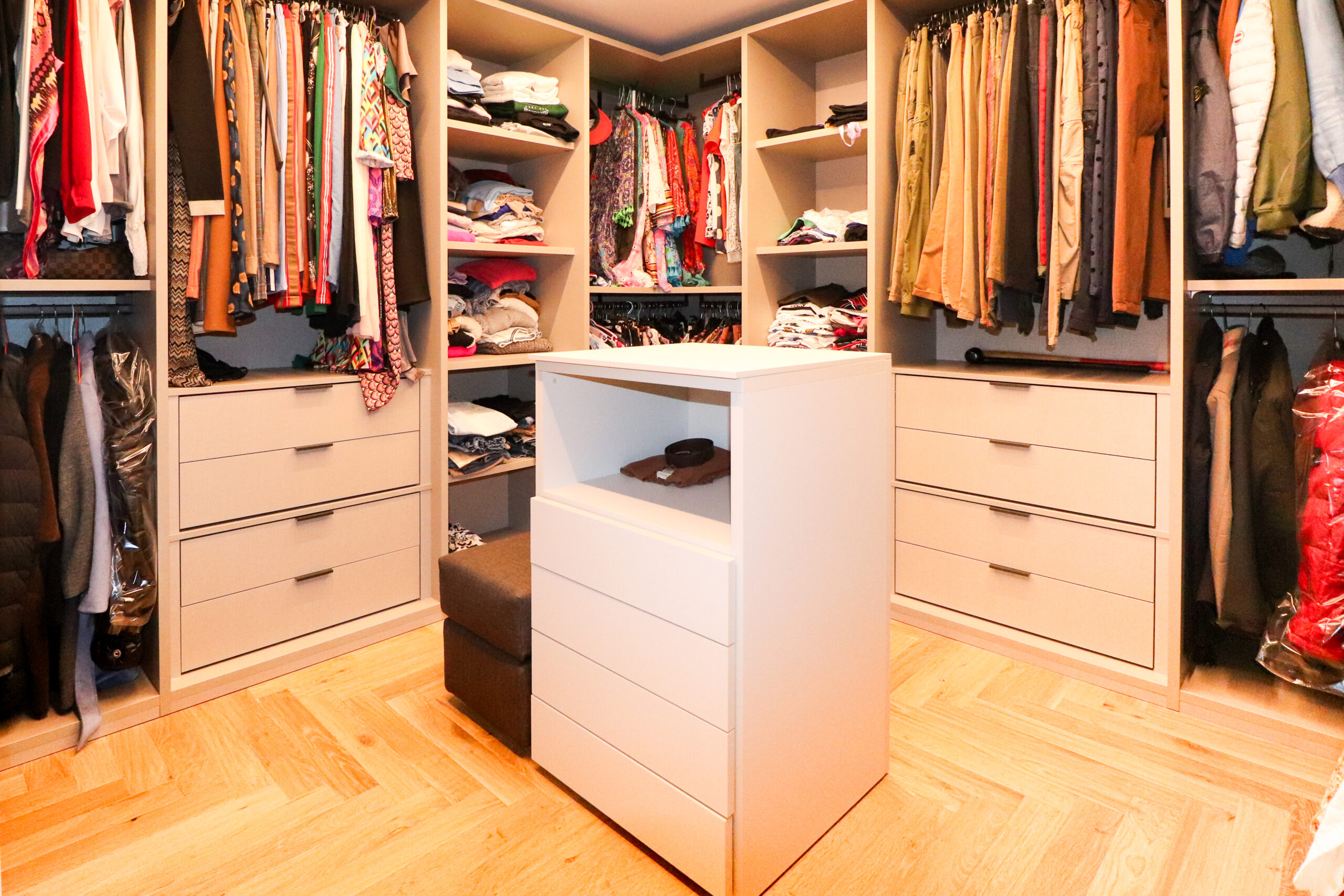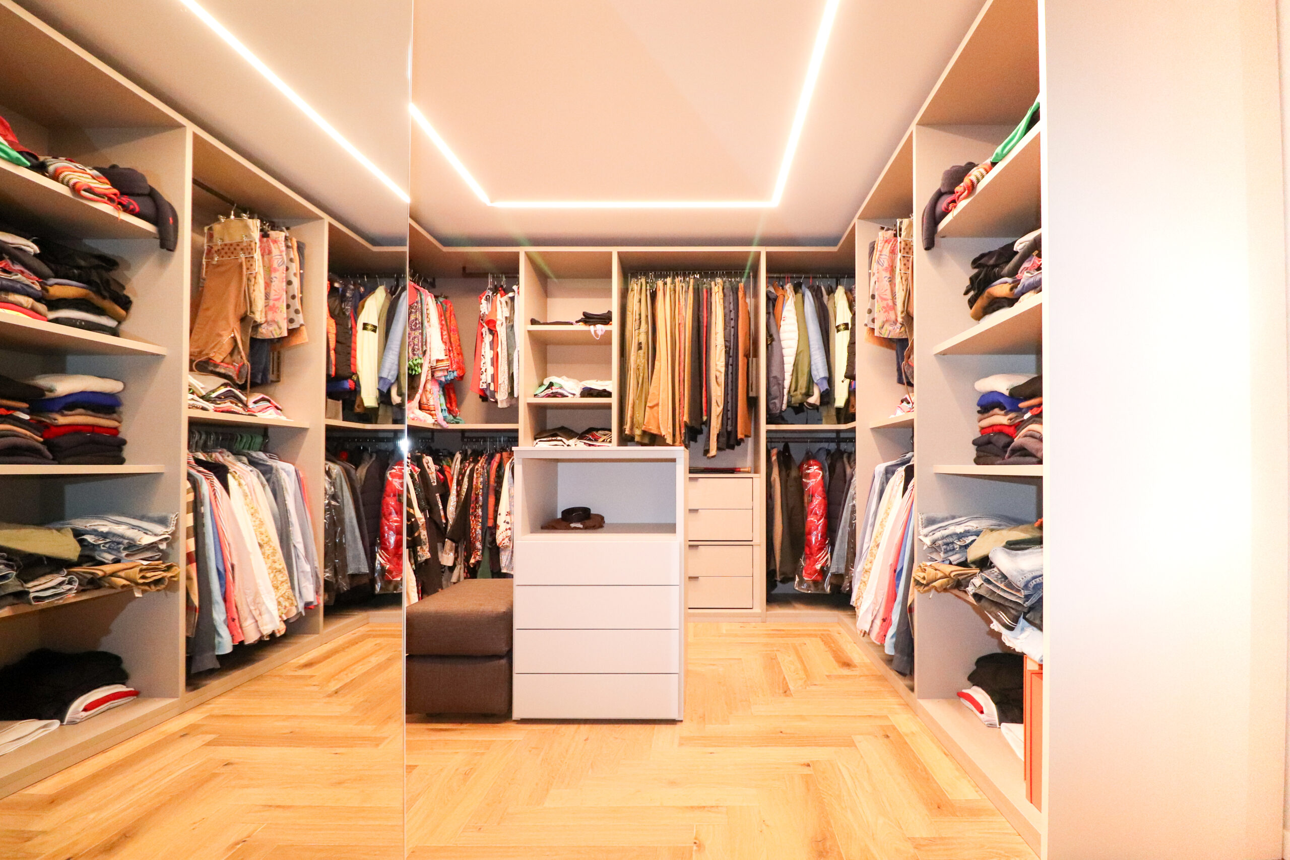 Infine, la cabina armadio è stata realizzata su tre pareti, con un’illuminazione a plafone che permette avere un’illuminazione omogenea sui capi appesi. Al centro è stata prevista una cassettiera, da utilizzare anche come appoggio, ed un pouff per potersi cambiare le scarpe.