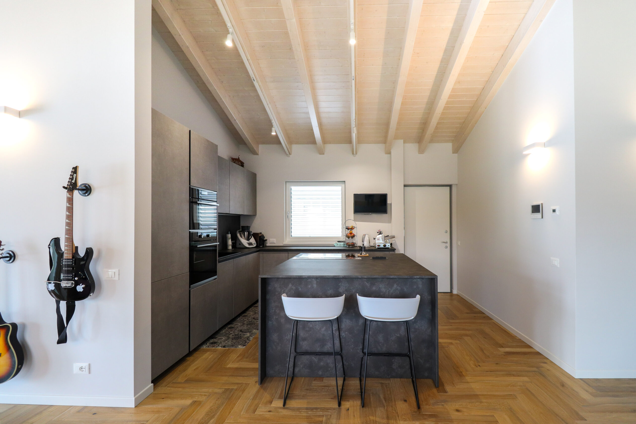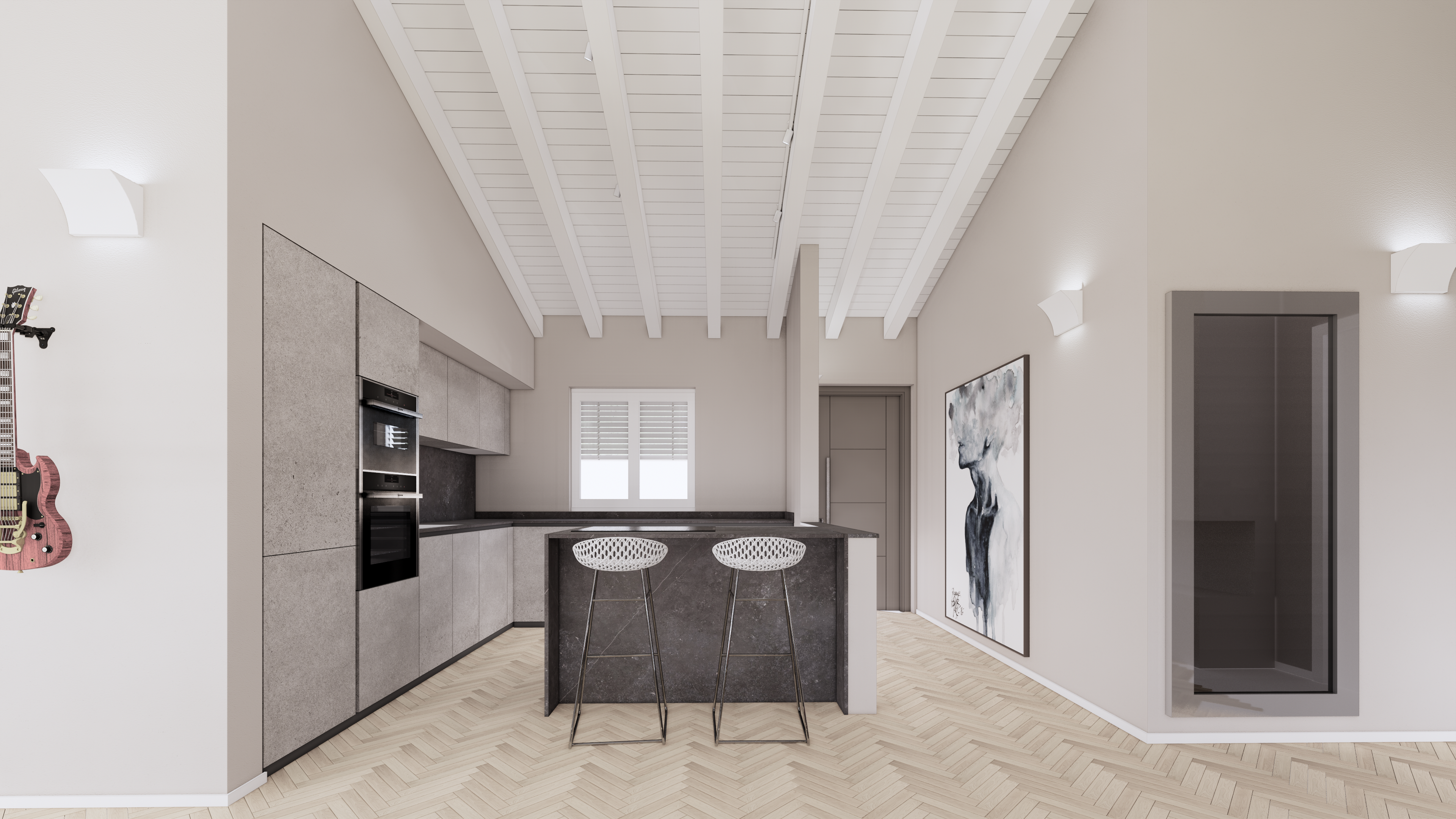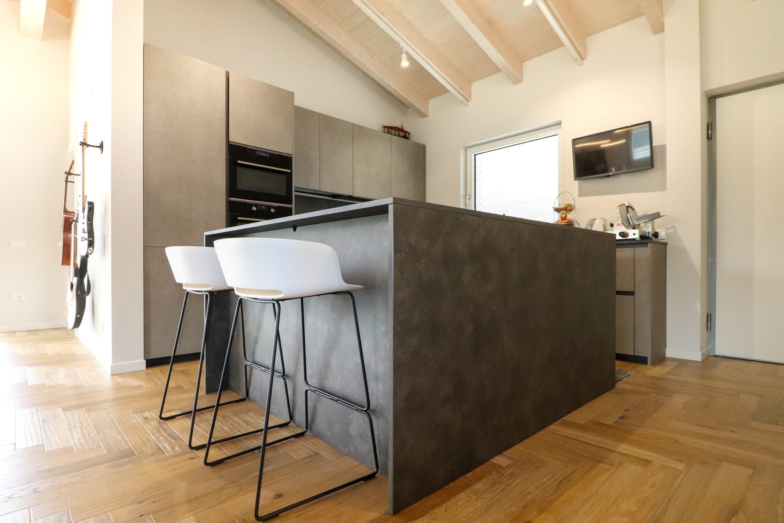 La cucina si integra perfettamente nel concept dell’open space, mantenendo coerenza estetica e funzionale con la zona living. Al centro della composizione, l’isola con piano a induzione funge anche da pratico piano di lavoro. Questo ambiente è pensato per vivere momenti di convivialità, senza compromessi tra design e praticità.