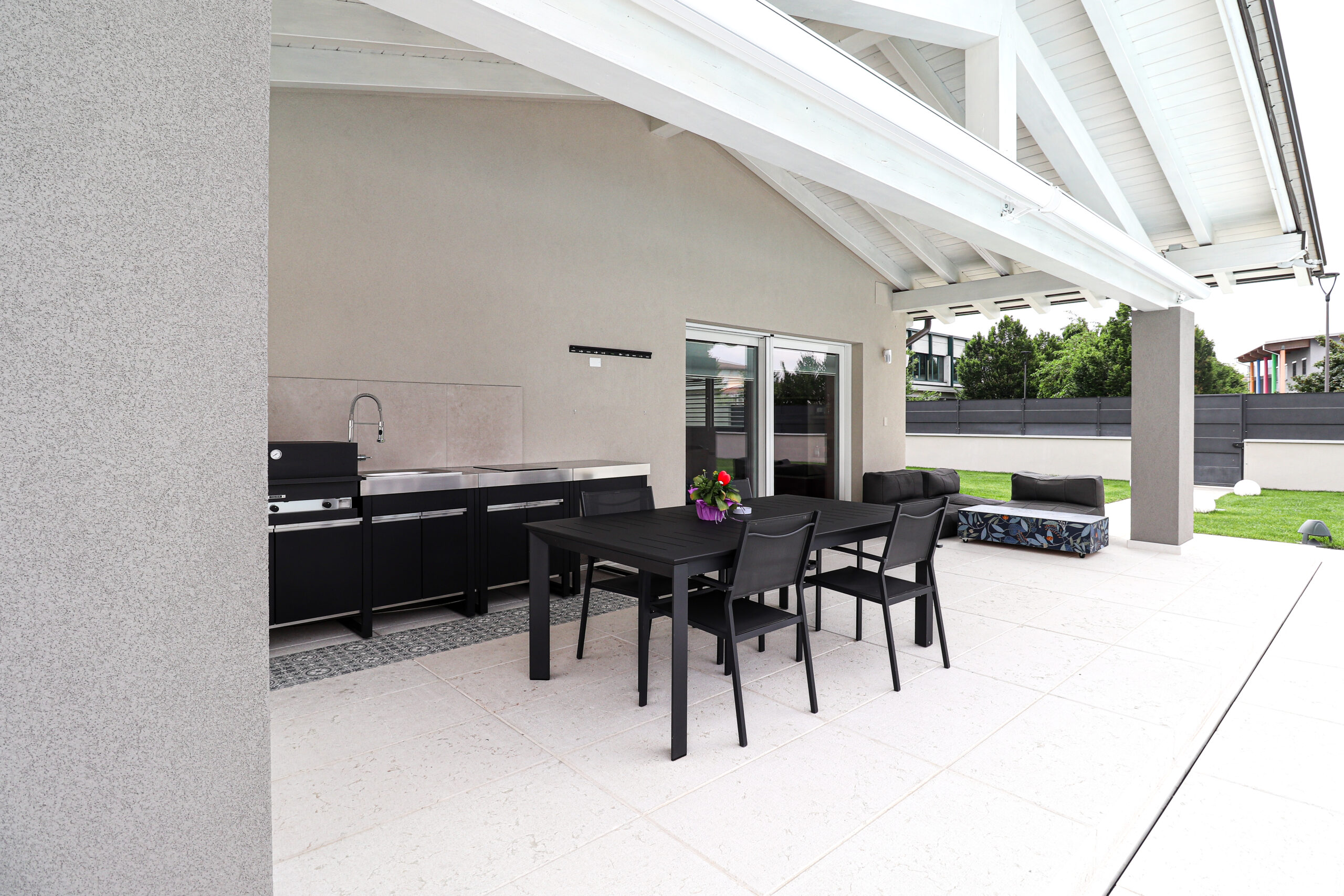 Abbiamo progettato una zona conviviale all’aperto, completa di cucina da esterni che combina praticità e design. L’area è arredata con un tavolo spazioso e sedute confortevoli, ideali per cene e momenti di condivisione, oltre a una zona relax con poltroncine e tavolino, perfetti per godersi attimi di tranquillità.