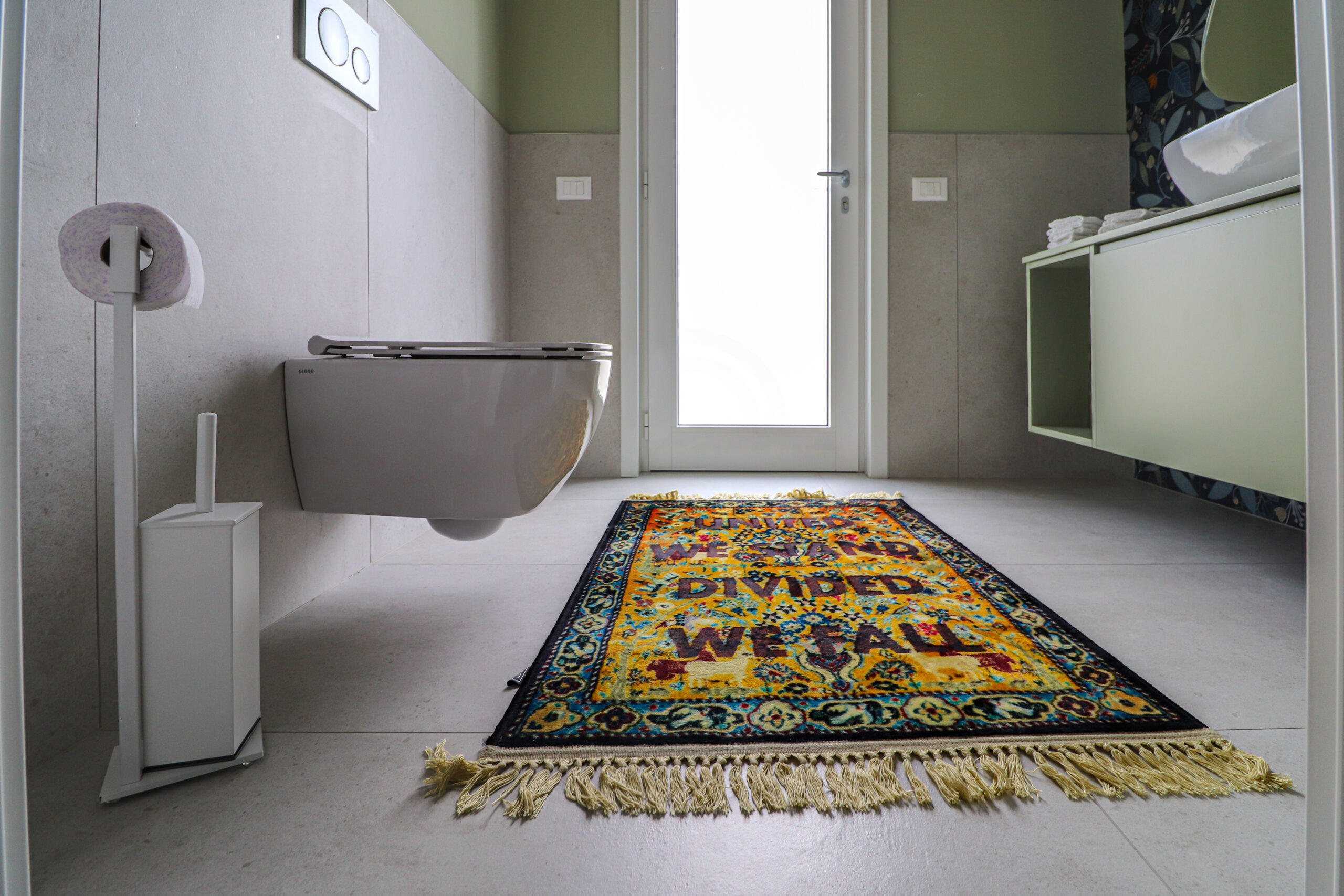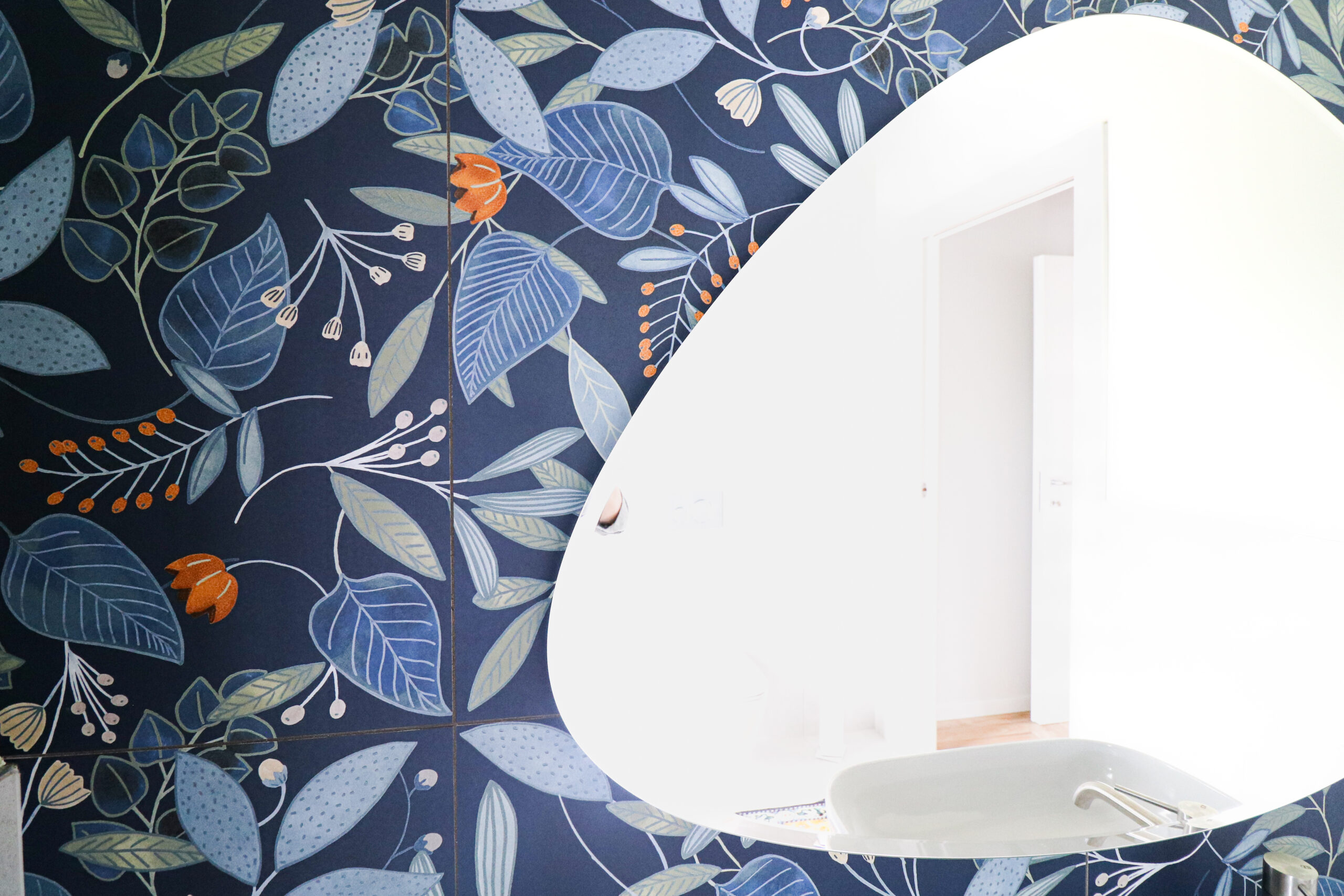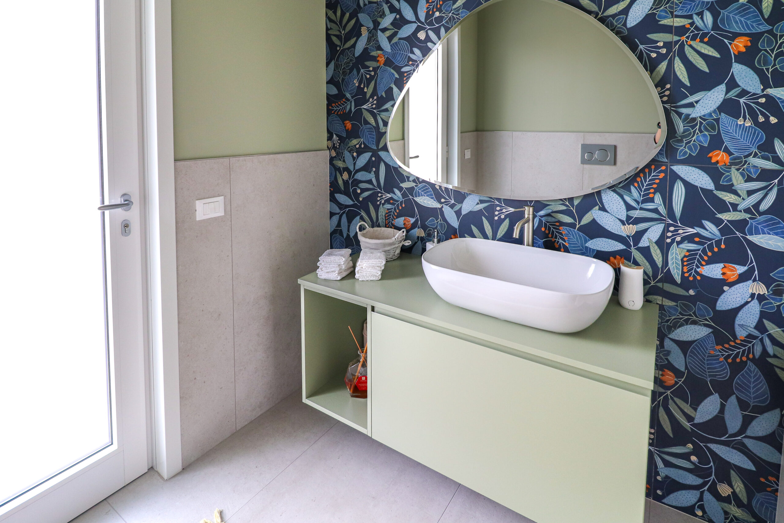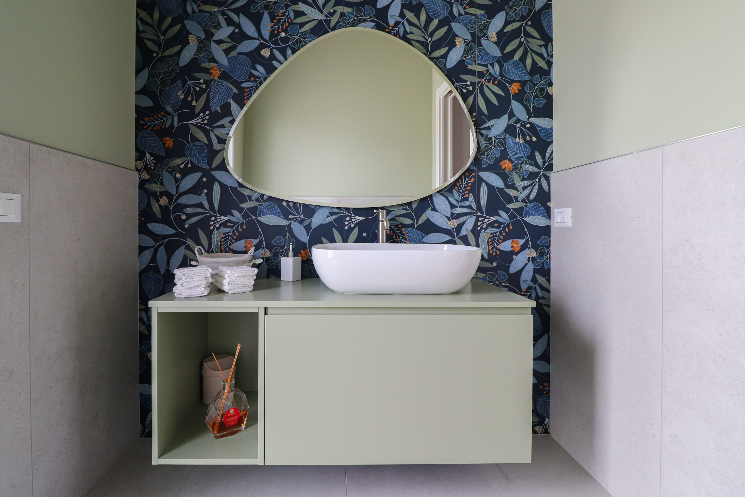Nel primo bagno si è scelto di valorizzare i toni del verde, presenti sia nella tinteggiatura dei muri sia nel mobile bagno. La parete del mobile è impreziosita da un gres a motivo floreale con sfumature di blu intenso. A completare il look, uno specchio dalla forma irregolare che rompe la geometria della stanza, aggiungendo un tocco di morbidezza al design complessivo.