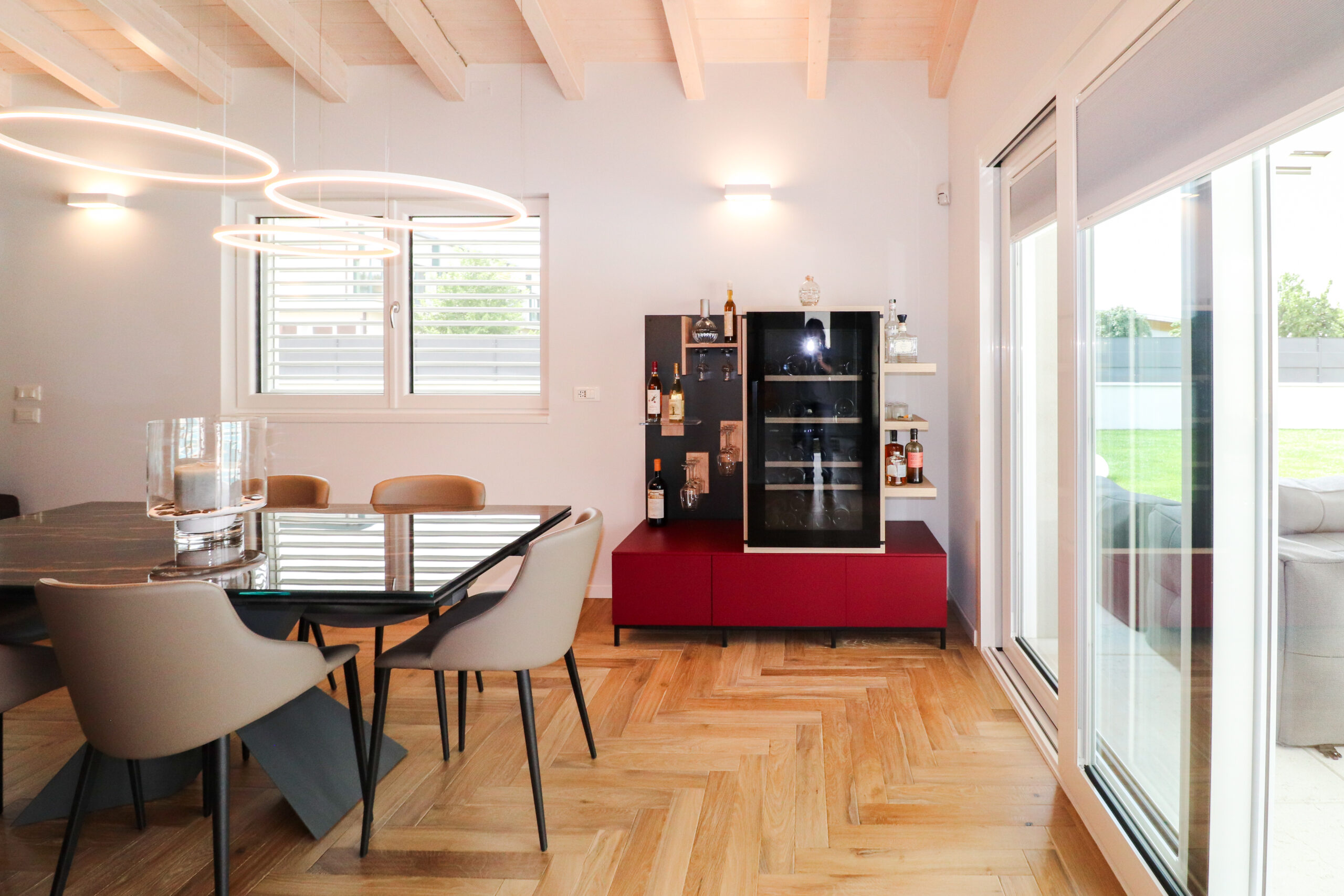 Per l’area esterna, l’intervento ha incluso l’allargamento della finestra sul portico, creando così una connessione fluida tra l’interno e l’esterno e favorendo una maggiore luminosità e accessibilità.