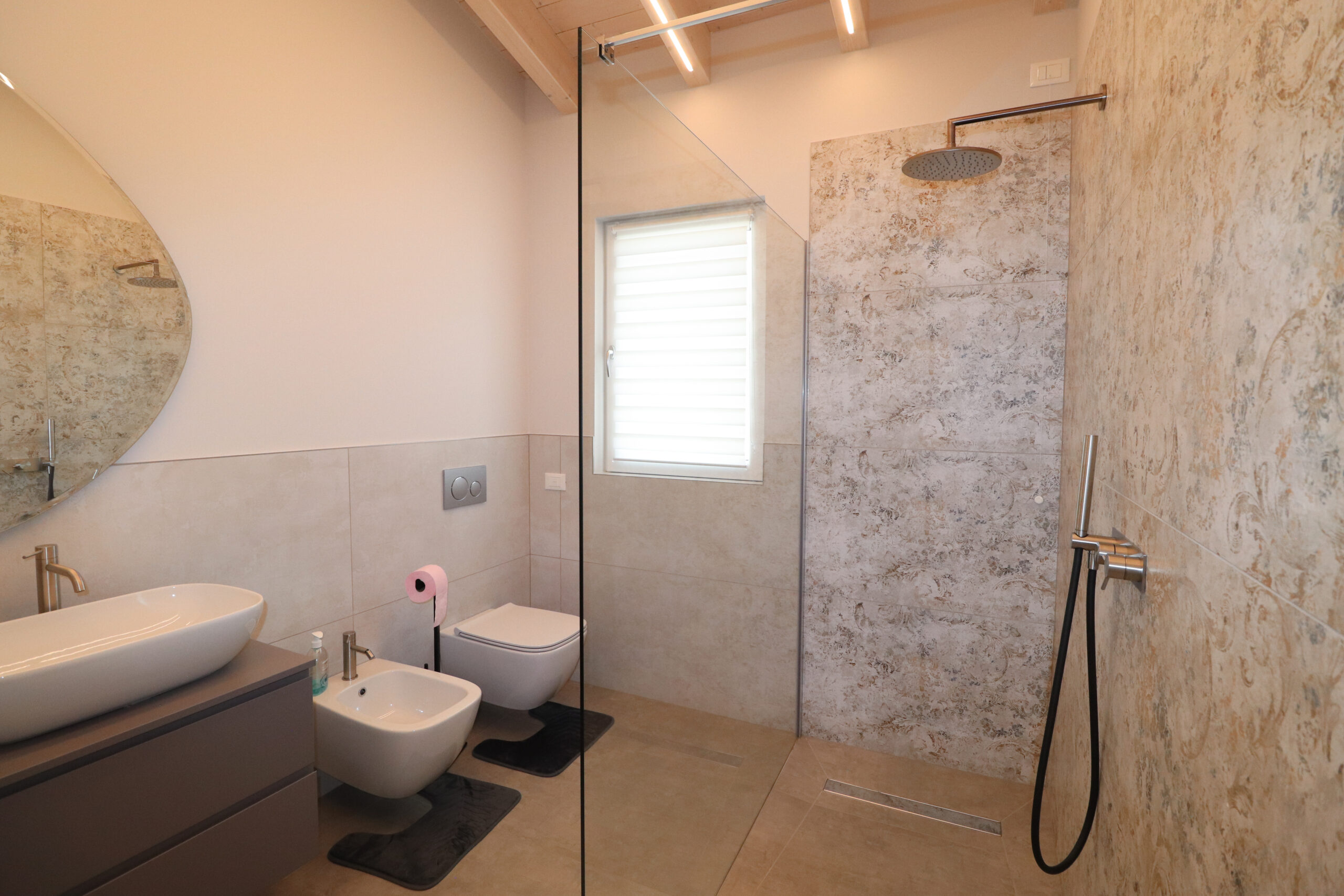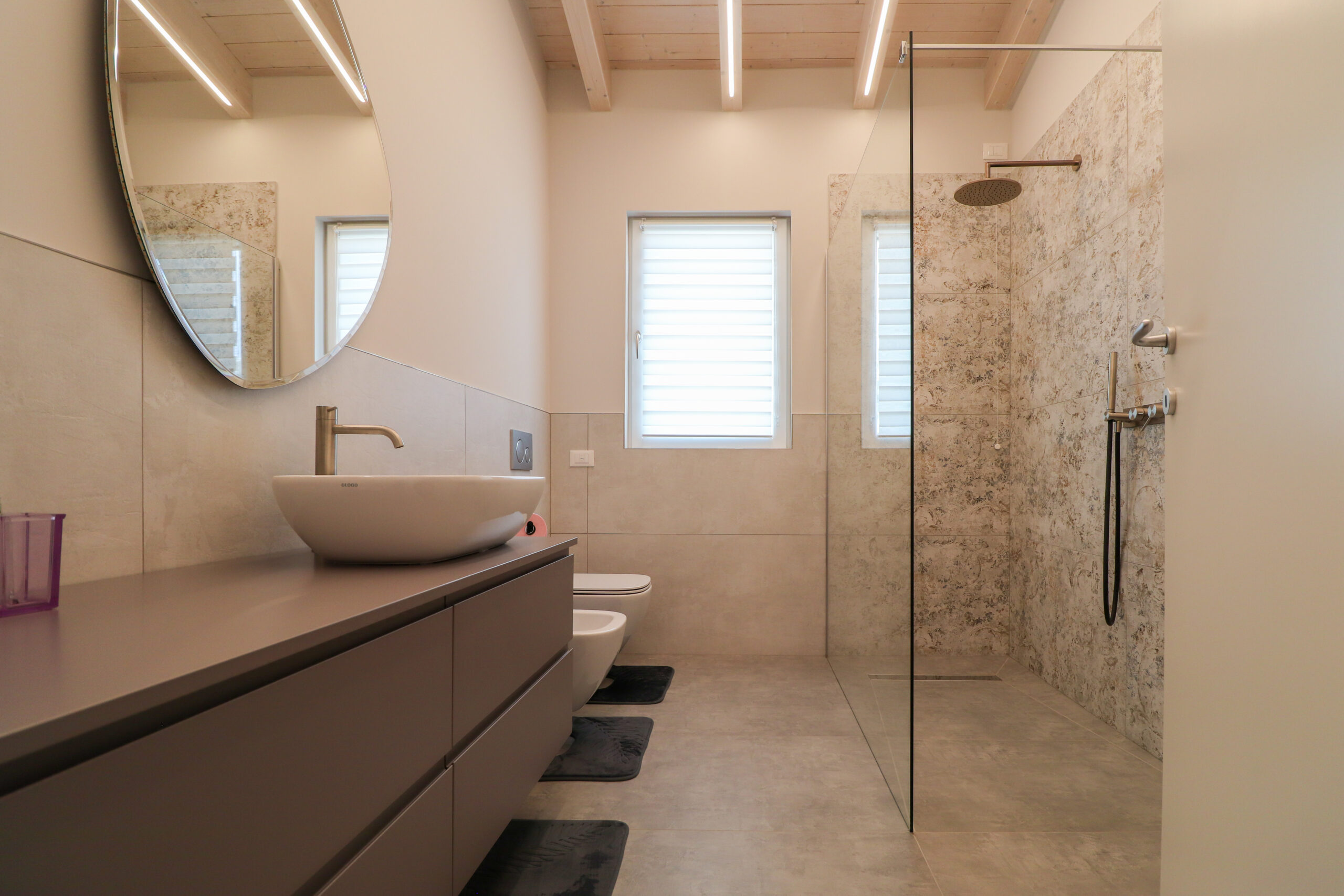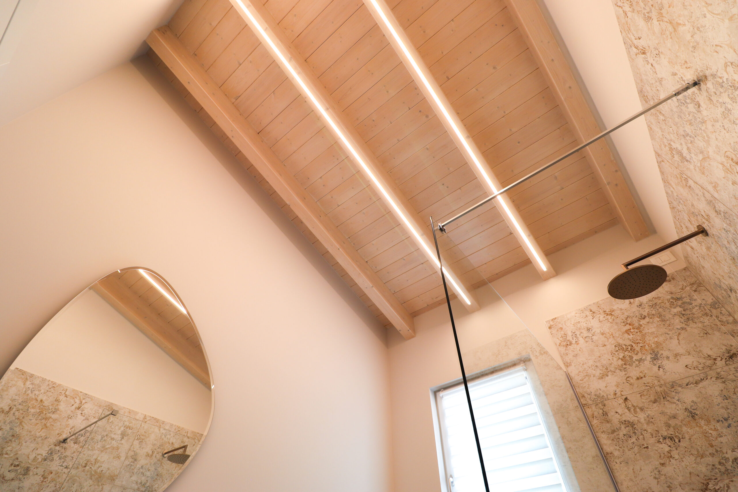 Il secondo bagno è caratterizzato da toni più neutri. La doccia walk-in è rivestita con materiali dalle finiture più materiche, che donano un tocco naturale allo spazio. Il mobile bagno, si inserisce nell’ambiente con toni neutri ma più decisi. L’illuminazione a LED segue ad incasso il profilo delle travi a soffitto, valorizzando l’architettura e portando luce diffusa nell’ambiente.